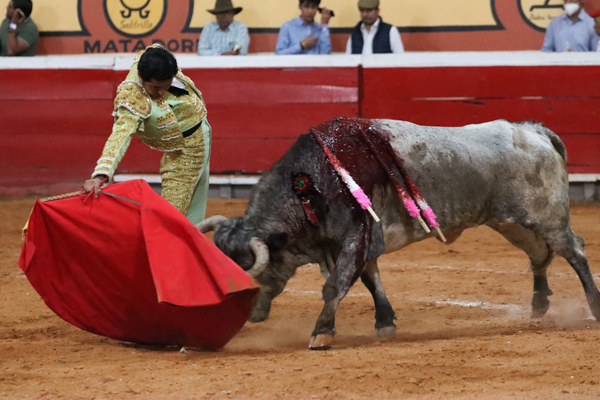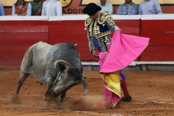 Fauro Aloi: Salida al tercio tras aviso, acompañado del forcado Hiram Gallardo que realizó la pega al de Marrón al primer intento.