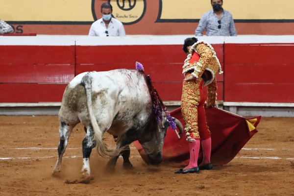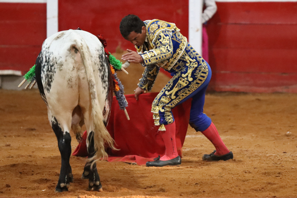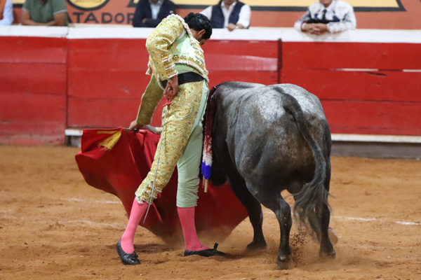Fauro Aloi: Salida al tercio tras aviso, acompañado del forcado Hiram Gallardo que realizó la pega al de Marrón al primer intento.
