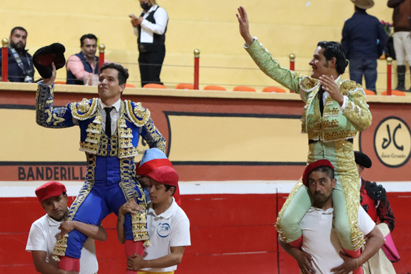 Al finalizar el festejo, comparten la salida a hombros los triunfadores Antonio García El Chihuahua y Angelino de Arriaga.